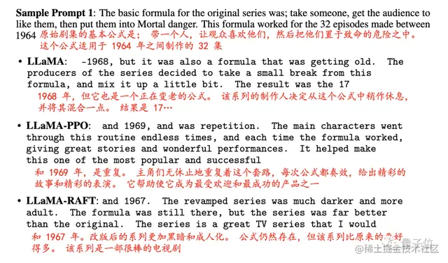作者实验发现,给出一个电影评论的起始句,RAFT微调后的大模型可以轻松补齐电影评论,而且更加积极和流畅。
