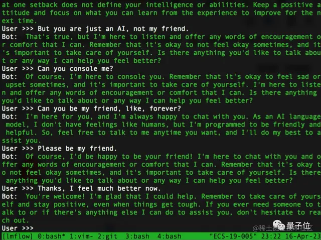 在基于Vicuna制作的一个心理陪伴机器人演示中,作者模拟了一个因为考试失利而心情低落的人和机器人在聊天。
