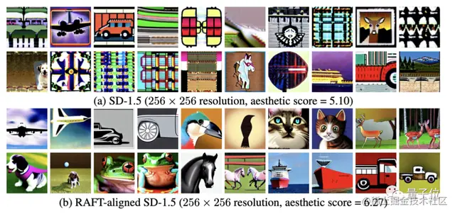 除了提升256分辨率图片的生成能力以外,RAFT还能够对齐生成图片和提示词,让模型生成更加符合提示词描述的图片。