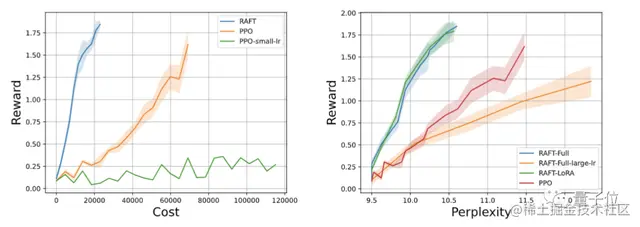 同时,在某些情况下, 由于有监督微调本身对于超参数敏感性更低, 有更稳健的收敛性, 在相同reward情况下,RAFT可以拥有更好的困惑度 (perplexity, 对应其生成多样性和流畅性更好)。