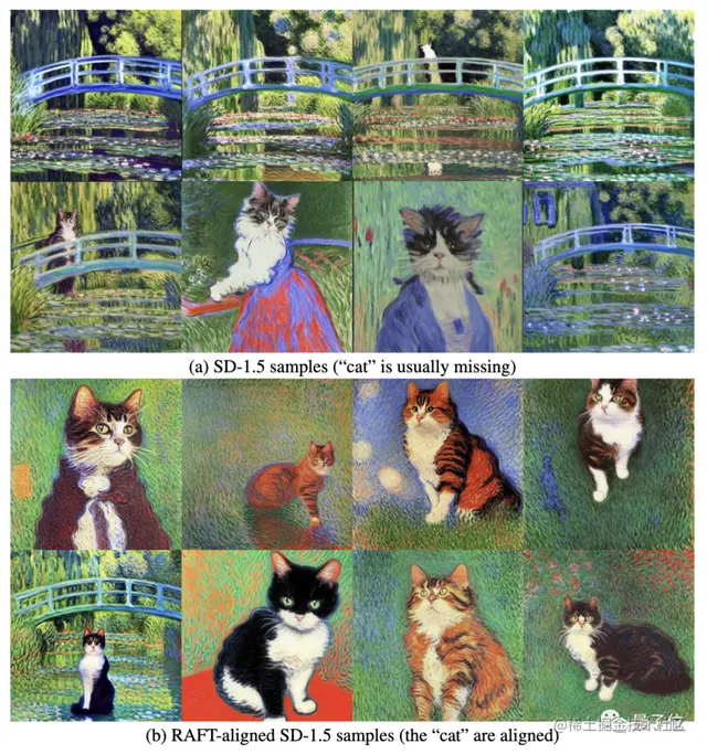 而经过RAFT微调后,stable diffusion认识到“猫”的概念,所以每张图片里都会有猫的身影。