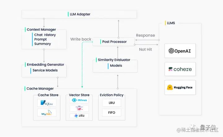 后期处理器整理最终响应返回给用户。它可以返回最相似的响应或根据请求的温度参数调整响应的随机性。如果在缓存中找不到相似的响应,后期处理器则会将请求转发给 LLM 来生成响应,同时生成的响应将被存储在缓存中。