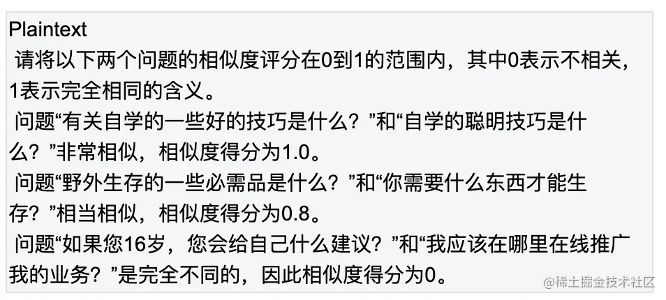 用 ChatGPT 生成的相似度分数来确定缓存的结果是否与查询问题相关。将正样本阈值设置为 0.6,使用以下 prompt 生成相似度分数: