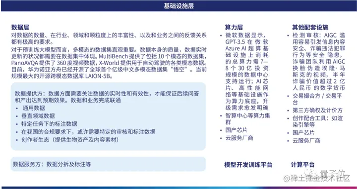 具体而言,基础设施层主要包含为行业提供数据、算力、计算平台、模型开发训练平台以及其他配套设施的企业。