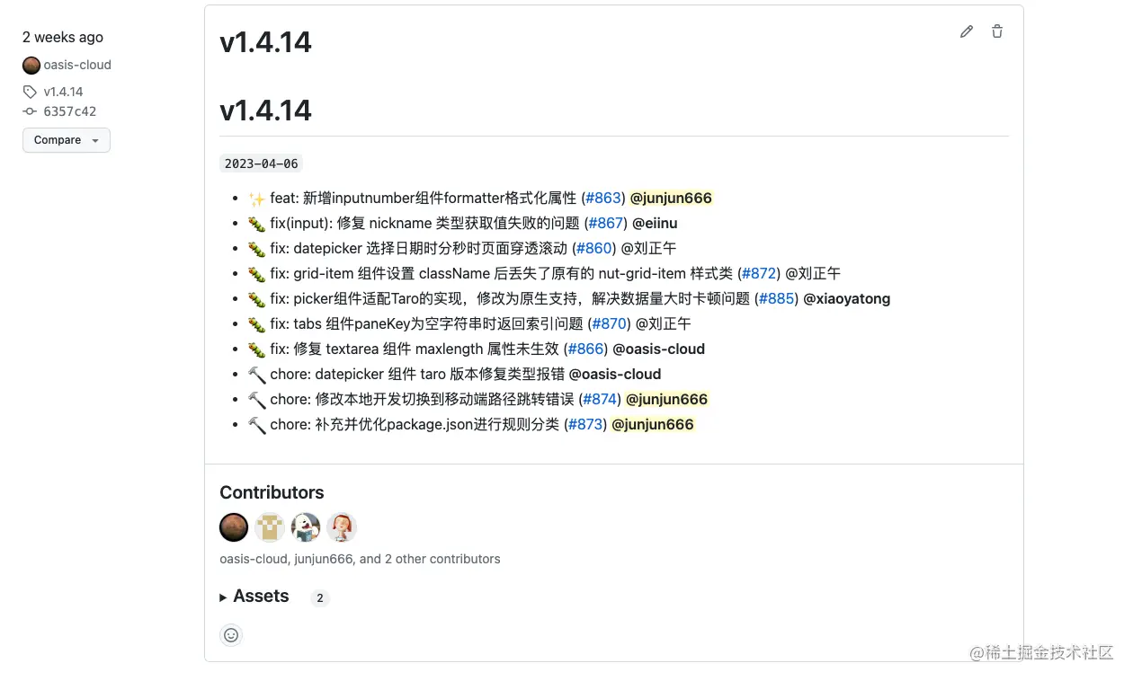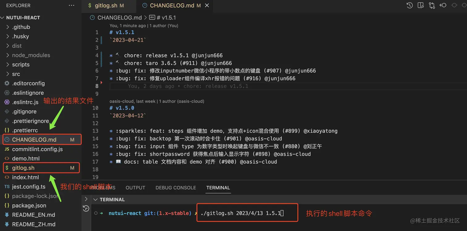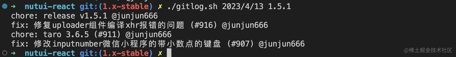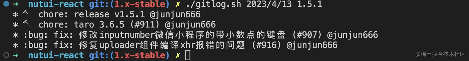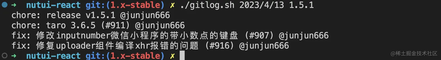 这里我们以NutUI-React最新发布的v1.5.1版本为例,执行方法:./gitlog.sh 2023/4/13 1.5.1