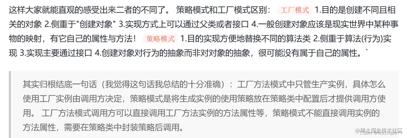 使用目的差异: 工厂模式当然是为了生产对象,只生产对象。而策略模式不是,策略模式是根据你传的参数来选择执行策略。他们直接的差别就是:工厂模式要生产一个给别人用的对象,策略模式要执行某段封装好的逻辑,可能有返回也可能没返回。