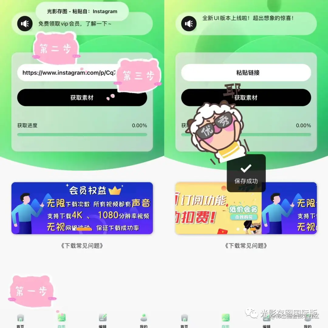 这个时候【光影存图】app就闪亮登场了,进入到存图页面后,粘贴链接到空白格内,然后点击获取素材,等进度条拉满就能看到保存成功的提示啦!