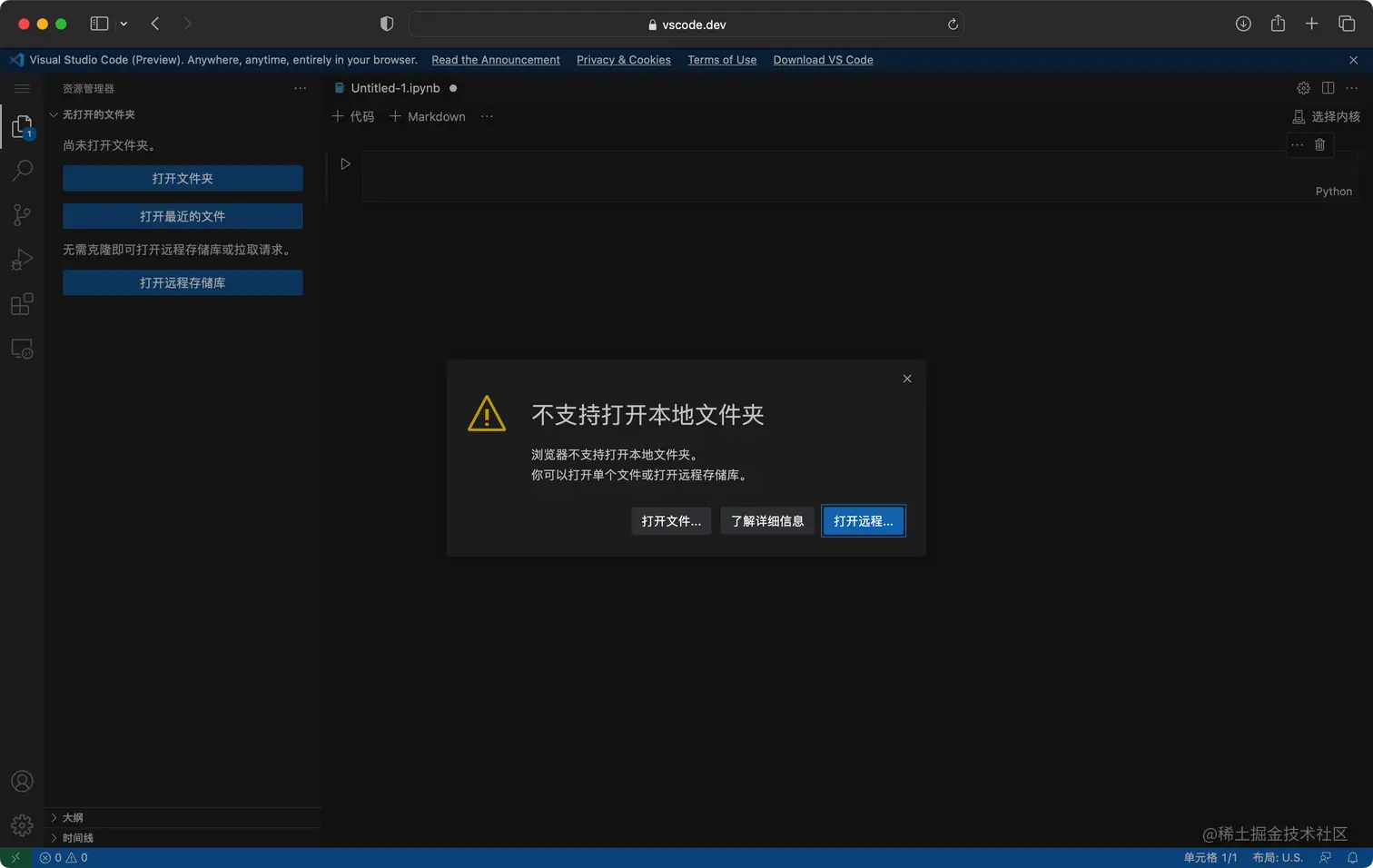 目前,Web API 还不支持文件的重命名,移动,复制,删除等操作,但是,我们可以通过 FileSystemDirectoryHandle 来实现这些操作,但是这也意味着,如果你需要对文件做复杂的操作的话,不支持该API 的浏览器是无法实现的!也无法降级处理,如下是 VSCode 在 Safari 上的表现: