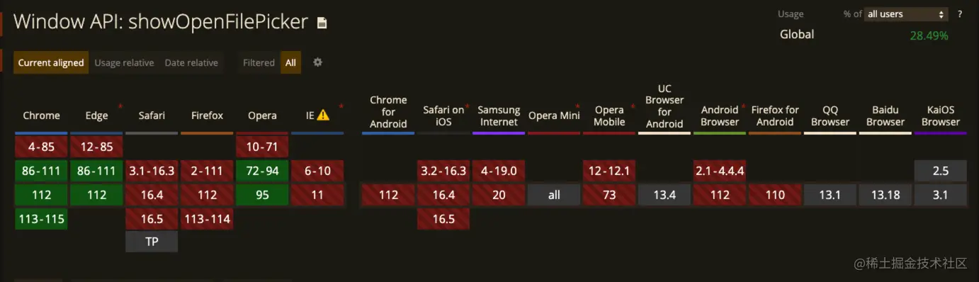 window.showOpenFilePicker 是一个新的 API,目前的支持度很低: