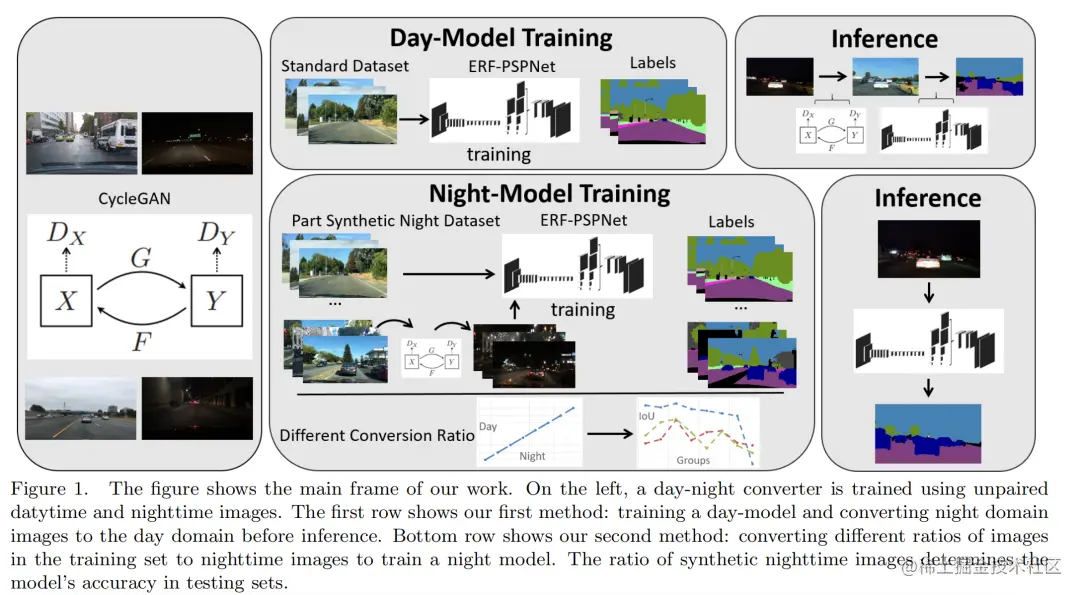 还有一种方法是通过GAN进行网络的前处理,比如说一个黑夜的图片我通过GAN将它变成白天场景。下图的方法通过训练一个CyCle GAN,可以满足图片从白天到黑夜的相互转化: