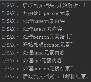 我们是把三种解析方式都糅合到一个demo中,所以最后才贴全部的效果图,这里的话,贴下打印的Log,相信大家会对SAX解析XML流程更加明了: