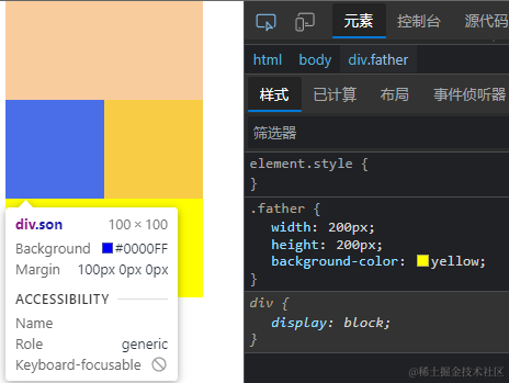 margin塌陷如图所示,父元素盒子不做设置,当子盒子设置margin-top后,父元素盒子也会随之变化.