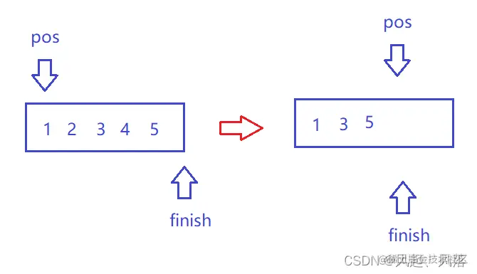遇到偶数就删除,并且每次结尾pos都会++,运行结束时正好pos位置等于finish