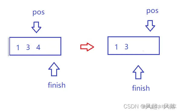 假设为最后一个位置被删除,finish会移动到到最后到3位置的后面,同时pos++,此时pos位置已经在finish位置后面,就会造成一直循环下去