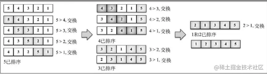 该示意图中每一小段表示外循环的一轮,而相邻两项的比较则是在内循环中进行的。