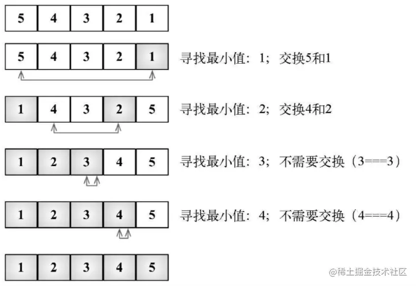 下面的示意图展示了选择排序算法,此例基于之前代码中所用的数组,也就是[5, 4, 3, 2, 1]。