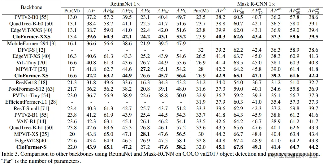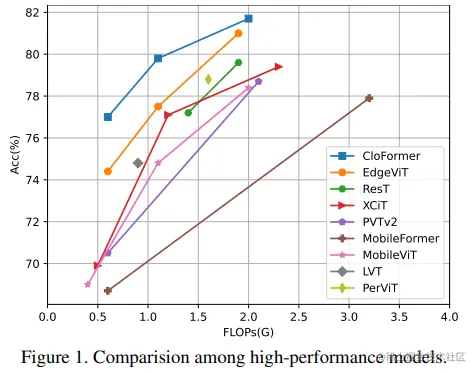 通过在主流计算机视觉任务上的广泛实验,如 ImageNet 分类、COCO 目标检测/实例分割 和 ADE20K 语义分割,充分证明了 CloFormer 的优越性。如图表所示,CloFormer 在具有相似 FLOPs 的模型中实现了最佳性能。
