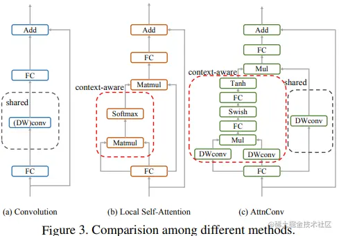最后,上图展示了三种不同的方法。相比于传统卷积,AttnConv 中的上下文感知权重使得模型能够更好地适应输入内容。相比于局部自注意力机制,引入共享权重使得模型能够更好地处理高频信息,从而提高性能。此外,生成上下文感知权重的方法引入了更强的非线性性,也提高了性能。需要注意的是,AttnConv 中的所有操作都基于卷积,保持了卷积的平移等变性特性。