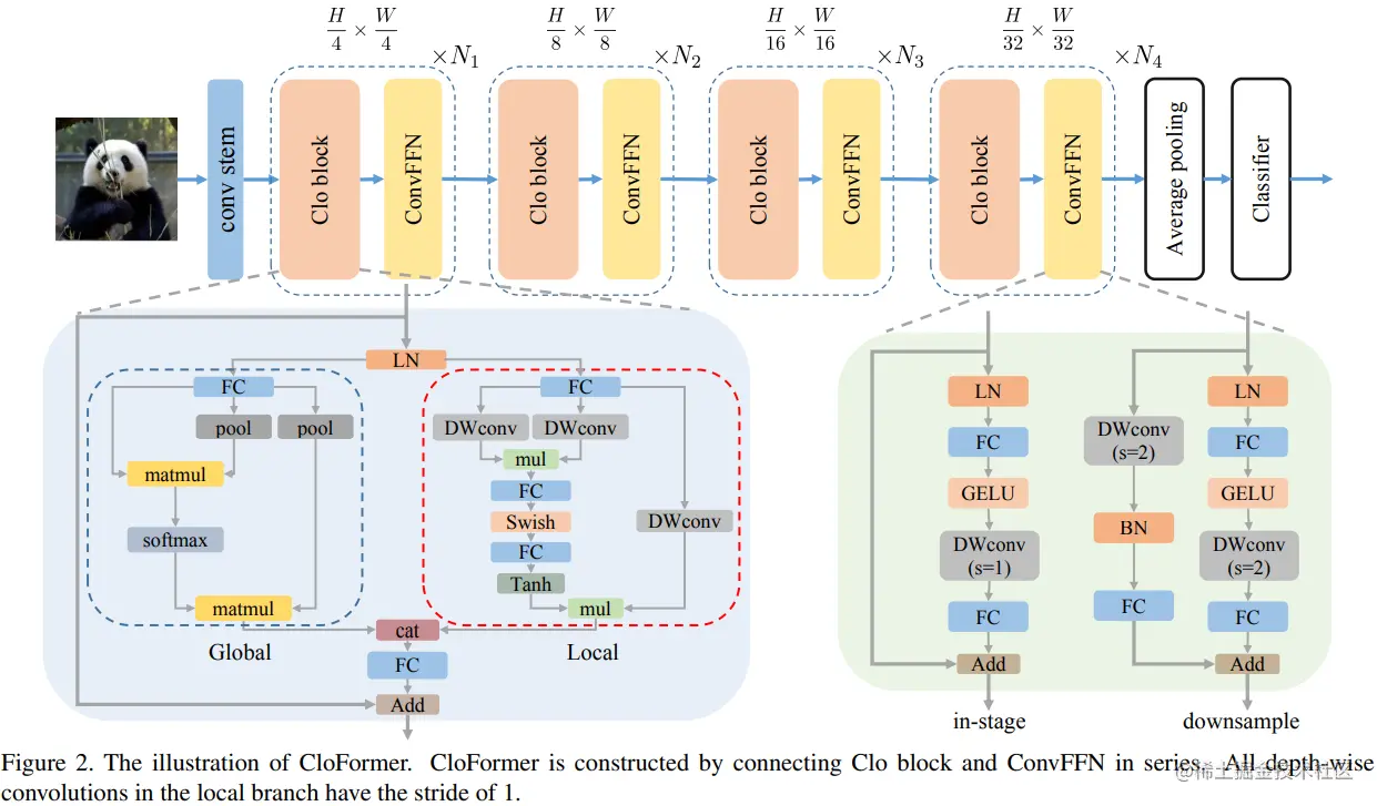 为了将局部信息融入 FFN 过程中,本文采用 ConvFFN 替换了常用的 FFN。ConvFFN 和常用的 FFN 的主要区别在于,ConvFFN 在 GELU 激活函数之后使用了深度卷积(DWconv),从而使 ConvFFN 能够聚合局部信息。由于DWconv 的存在,可以直接在 ConvFFN 中进行下采样而不需要引入 PatchMerge 模块。CloFormer 使用了两种ConvFFN。第一种是在阶段内的 ConvFFN,它直接利用跳跃连接。另一种是连接两个阶段的 ConvFFN,主要用于下采样操作。