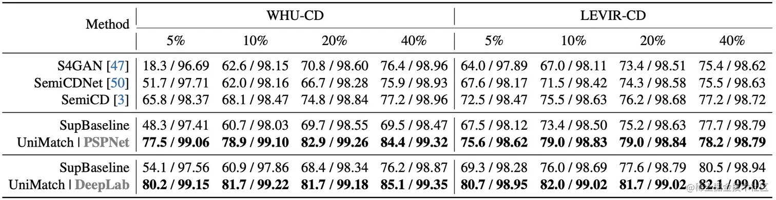 这里,我们在两个主流数据集WHU-CD和LEVIR-CD上做了验证,尝试了PSPNet和DeepLabv3+两种网络结构,在所有的数据划分下都取得了显著提升: