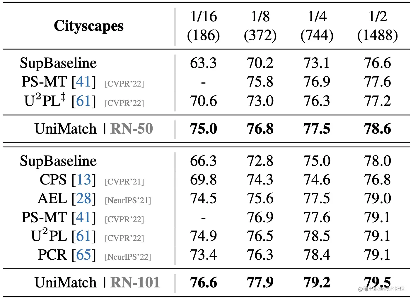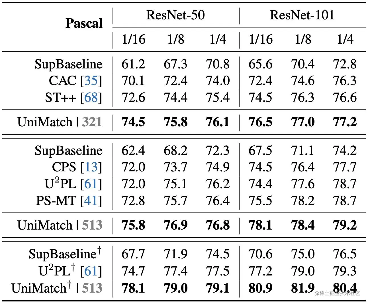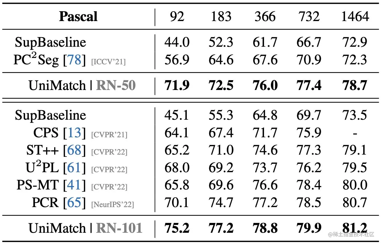 可以看出,UniPerb和DusPerb相对于FixMatch都有显著提升,最终UniMatch取得了最优结果。