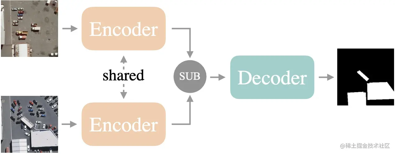 该场景要求通过同一地点、但不同时间的遥感影像来识别出变化的地块,可以大致看作一个二分类的分割问题。通常的框架如下所示,利用编码器分别提取两张影响的特征,之后对他们特征相减后再送入解码器进行预测。