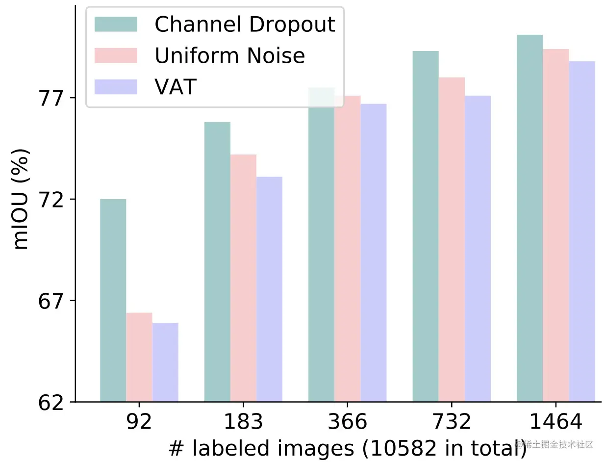 如此一来,相比于FixMatch,我们多了一个可学习的特征强扰动分支 。这里,$p^w$ 便可以同时作为 和 的伪标签,用于监督这两个分支的训练。值得一提的是,我们采用的特征扰动策略极其简单,仅需对特征进行通道维度的Dropout。具体实现上,只需调用Pytorch中nn.Dropout2d(p)函数,其中p=0.5。