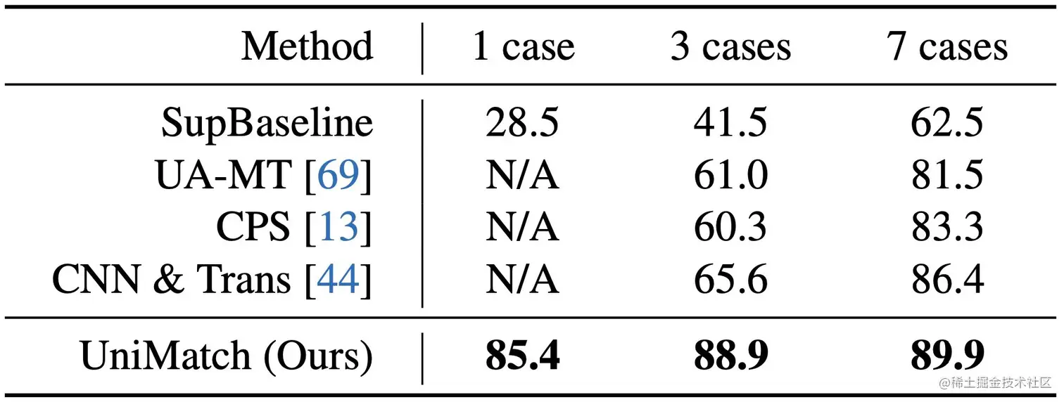 从上述表格结果可以明显地看出,当且仅用1个标注case时,UniMatch即可远远超过其他利用3个标注cases的方法!
