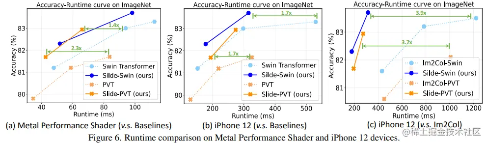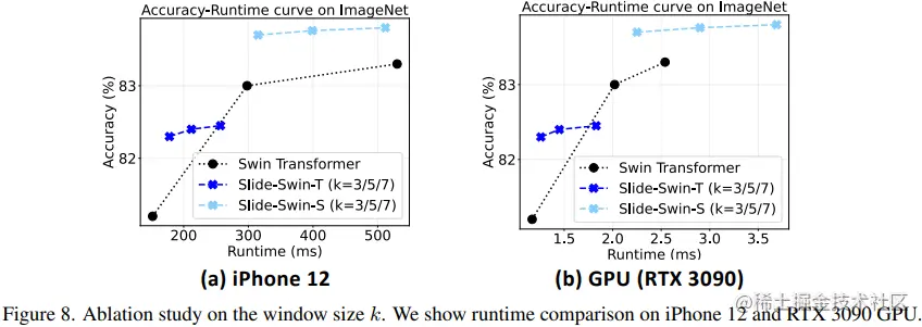重点看下上图,图中展示了所提方法在不同硬件下的实际推理时间,包括边缘端(iPhone 12)和服务器端(RTX 3090)。可以看出,与基线相比,嵌入滑动注意力模块后可以在不同设备上的运行时和模型性能之间表现出明显更好的权衡,并且在 Vision Transformer 模型上实现了高达 2.3 倍的加速。顺便一提,对于其他局部注意力模块,由于基于 CUDA 的方法无法在这些设备上实现,作者这里仅将所提方法与基于 Im2Col 的方法进行比较。