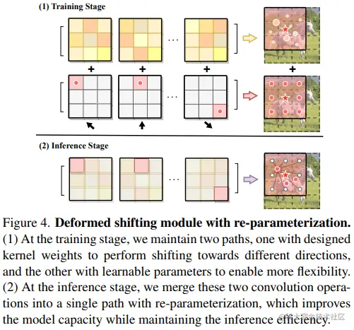 这种新的见解让我们有机会更进一步应用精心设计的Depthwise Convolutions来代替原本的移位操作。 如此一来,我们便可以将Im2Col函数替换为标准的卷积运算,这样便能够很容易部署到不同的硬件设备上。 此外,为了进一步增强灵活性,我们引入了一种新颖的可变形移位模块。如图 1(c) 所示,该模块将固定键和值位置relaxes到局部区域内的可变形特征。通过使用重参数化技术,既有效地增加了模型容量,又同时保持了推理效率。