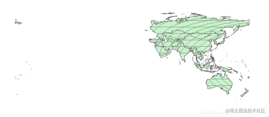 可以看到,结果图层中,是依据输入图层中每一个独立部分而独立存在的。例如下图绿色部分,其为蒙古国与MODIS hv编号分别为25、4的区域这二者的交集。