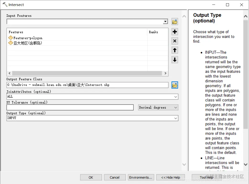将前述两个矢量面要素作为输入要素放入“Input Features”中;第二项为输出要素的路径与名称,第三项为属性联合,也就是决定原有输入要素中,每一个要素各自属性表中哪些字段继续出现在输出要素中,一般默认即可;第四项为要素之间的最小容差;第五项为输出要素的类型。