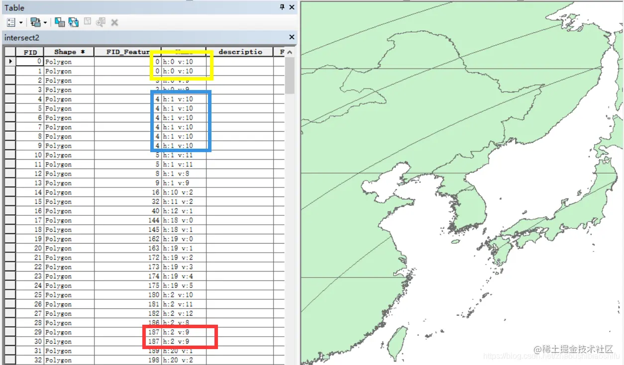 这样子虽然得到了二者的交集,但是依然有一个问题:想知道有哪些MODIS分幅覆盖在这个区域,但是现在得到的要素变得非常零散,会出现同一个分幅编号在多个要素部分中出现的情况,如下图所示。这严重干扰了分幅编号的确认。