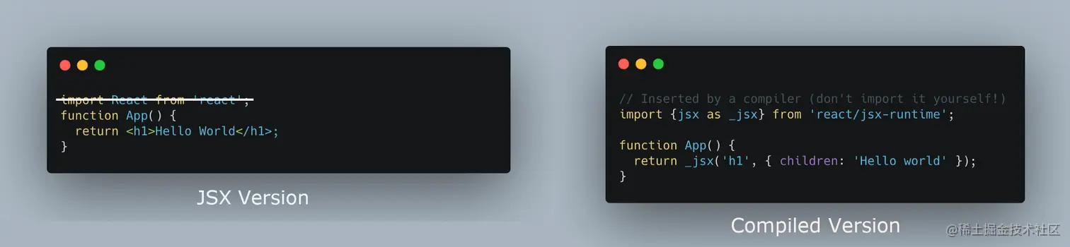大白话,其实就是新版 React 让 babel 加了一个引用,省去了自己引用 React。但是呢,引用整个 React又太多了,所以单独建立一个包,专门转换 jsx 的。