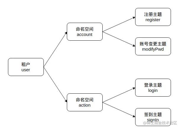 租户、命名空间:Pulsar定义了租户、命名空间的概念,Pulsar是一个多租户系统,它给不同的租户分配不同的资源,并保证不同租户之间的数据相互隔离,互不干预,这样可以支持多团队、多用户同时使用一个Pulsar服务。每个租户还可以创建多个命名空间,命名空间为主题的逻辑分组。可以将Pulsar理解为一个大房子,每个租户是房子里的一个房间,并且这个房间的空间划分为不同的区域(命名空间),不同区域存放不同的物件。例如,用户服务可以创建一个租户“user”,存储用户服务的消息。该租户可以按自己的业务场景,创建多个命名空间,存放不同的主题,如图1-3所示。