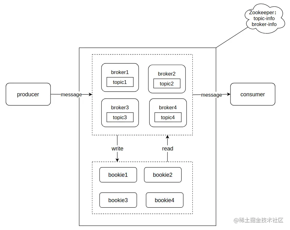Broker:Pulsar集群中的服务节点。需要注意,Pulsar由于采用计算、存储分离的架构,因此Pulsar Broker节点只负责计算,并不负责存储,Pulsar Broker节点会完成数据检验、负载均衡等工作,并将消息转发给Bookie节点。