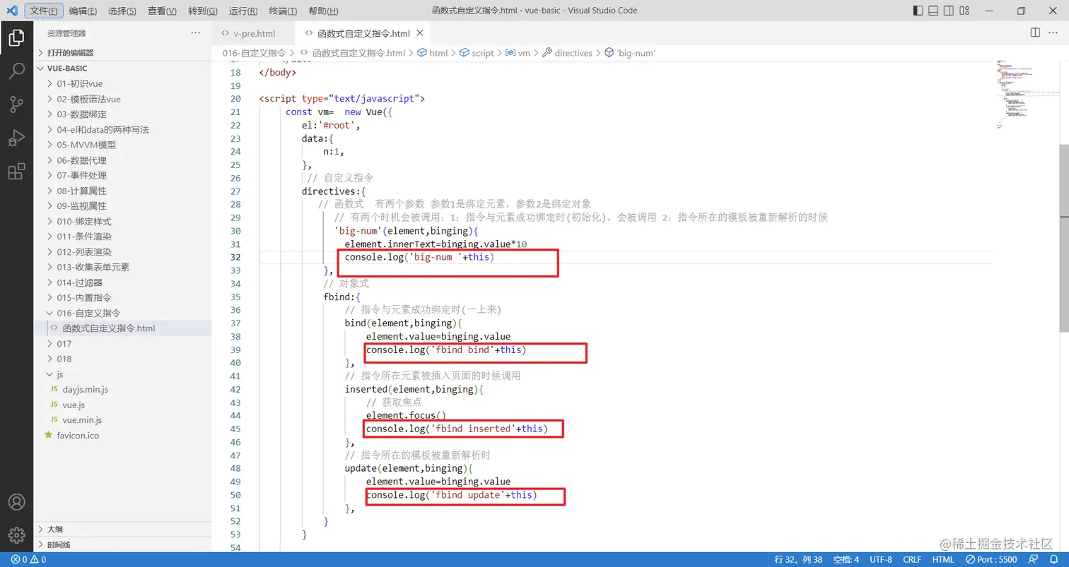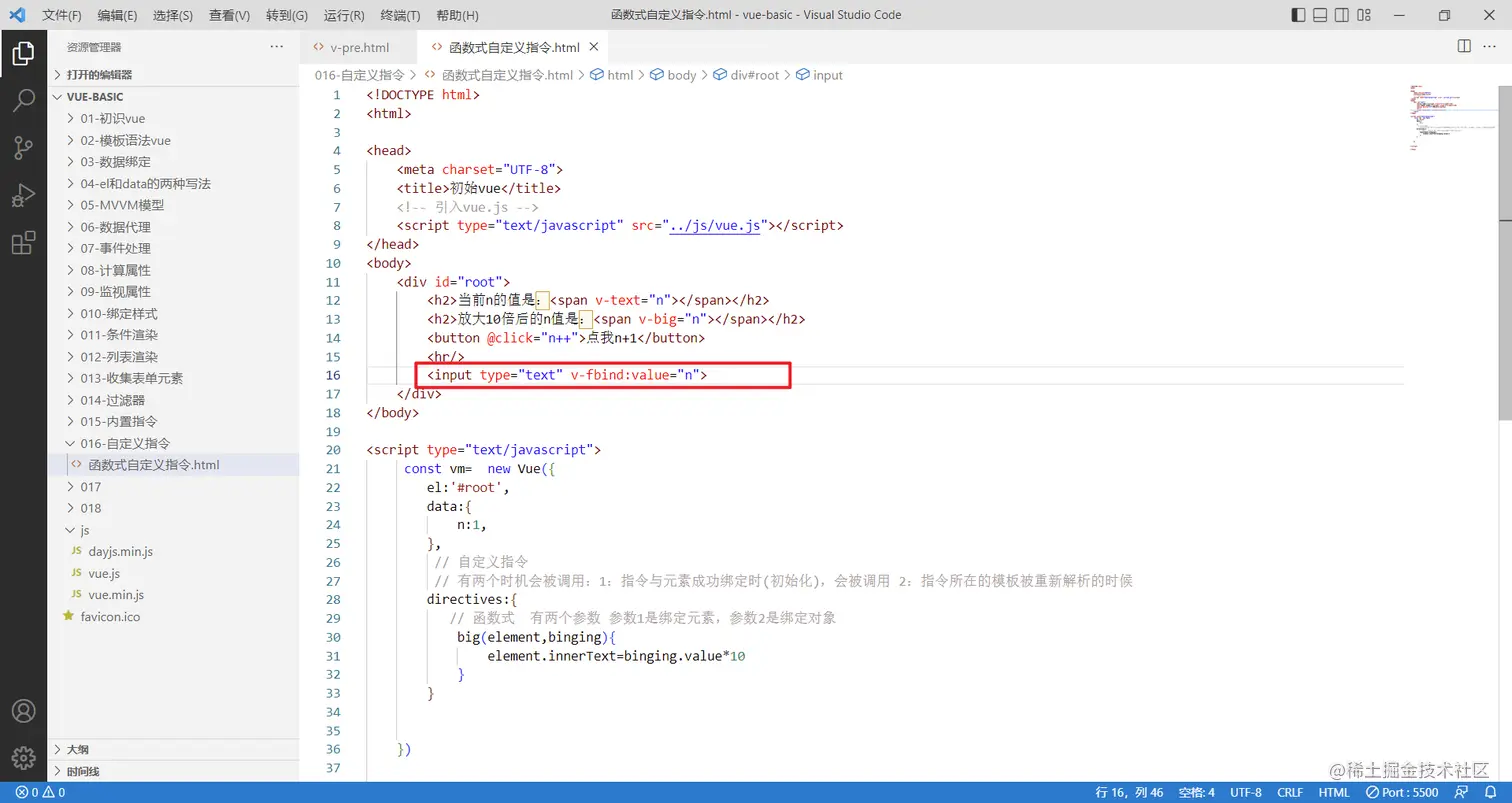 接下来就要定义指令了,需要一个全新的配置项:directives,它的值也是一个对象,和computed,watch是类似的写法