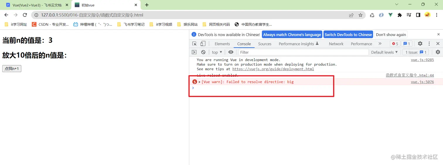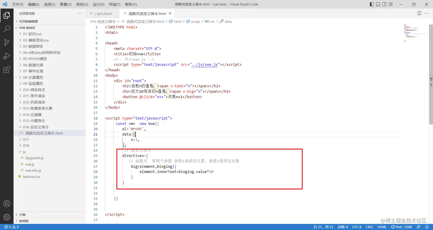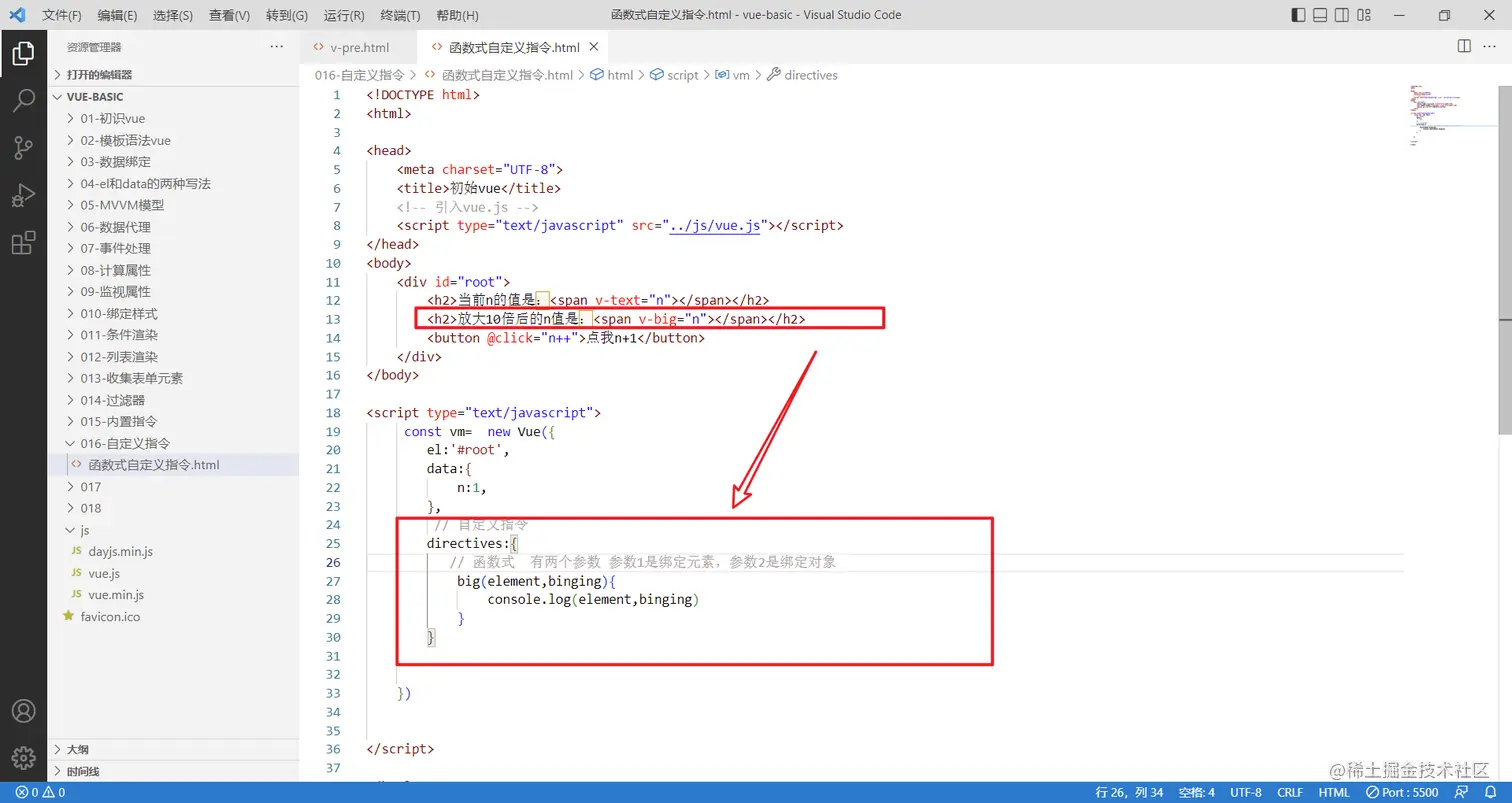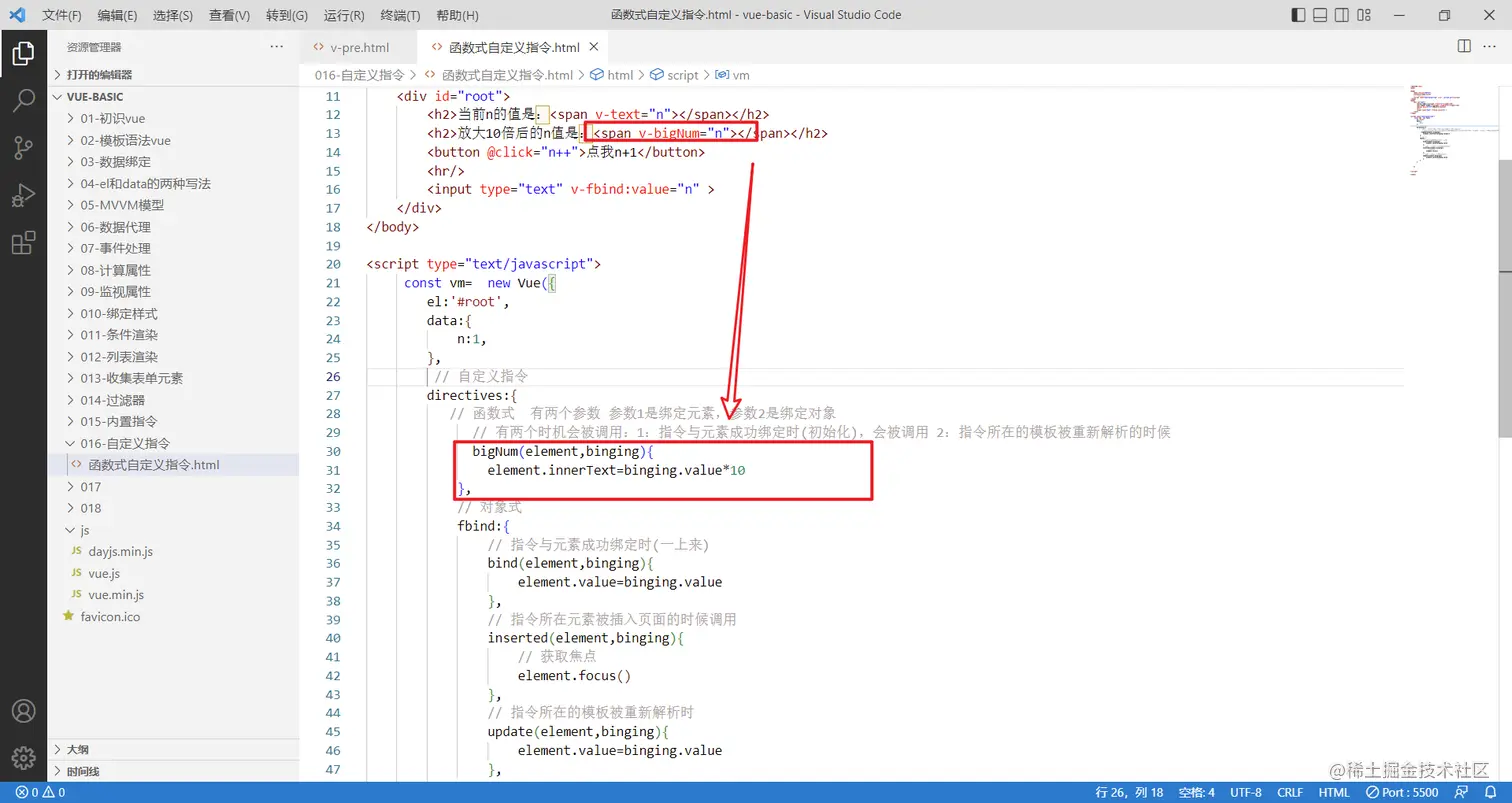 需求:定义一个v-big指令,和v-text功能类似,但是会把绑定的数值放大十倍