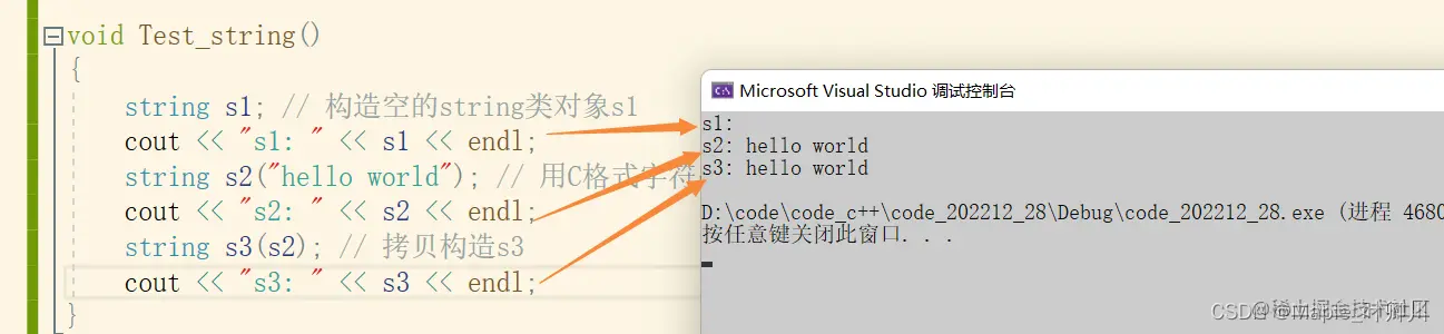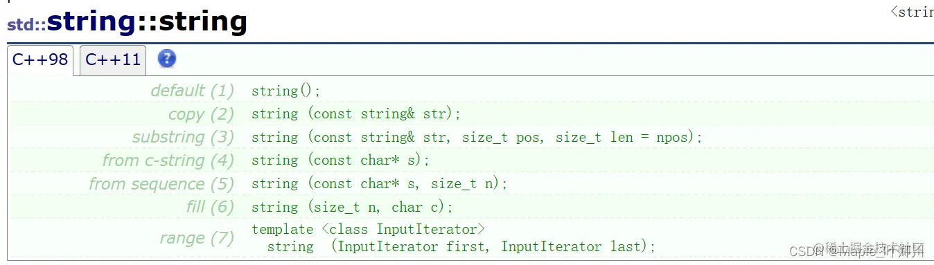 (constructor)函数名称 函数功能 string() (重点) 构造空的string类对象,即空字符 string(const char* s) (重点) 用字符数组来构造string类对象 string(const string&s) (重点) 拷贝构造函数 string(size_t n, char c) 用n个c字符来构造string类对象