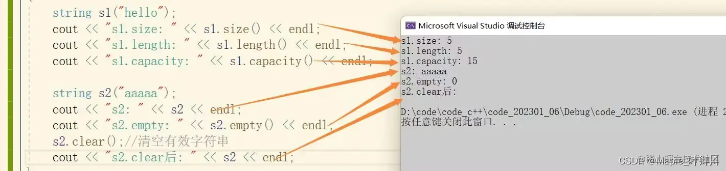 函数名称 功能说明 size(重点) 返回字符串有效字符长度 length 返回字符串有效字符长度 capacity 返回空间总大小 empty(重点) 检测字符串释放为空串,是返回true,否则返回false clear(重点) 清空有效字符 reserve(重点) 为字符串预留空间** resize(重点) 将有效字符的个数该成n个,多出的空间用字符c填充