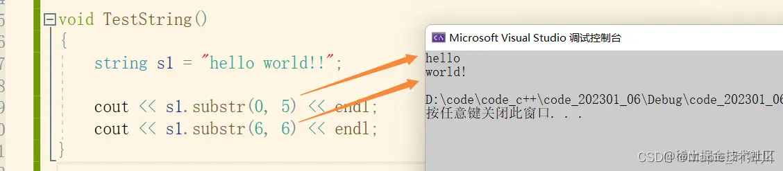 函数名称 功能说明 c_str(重点) 返回C格式字符串 find(重点) 从字符串pos位置开始往后找字符c,返回该字符在字符串中的位置 rfind 从字符串pos位置开始往前找字符c,返回该字符在字符串中的位置 substr 在str中从pos位置开始,截取n个字符,然后将其返回