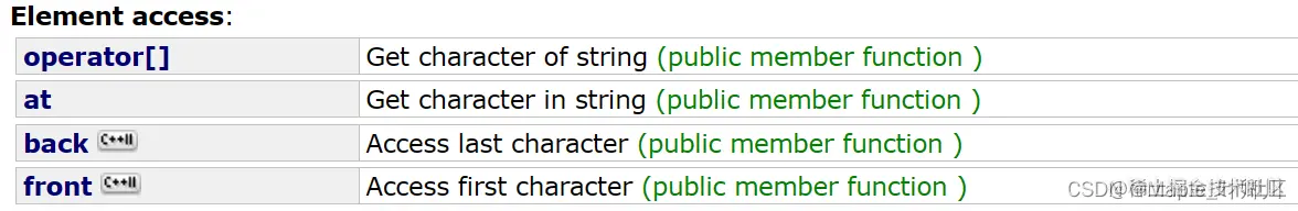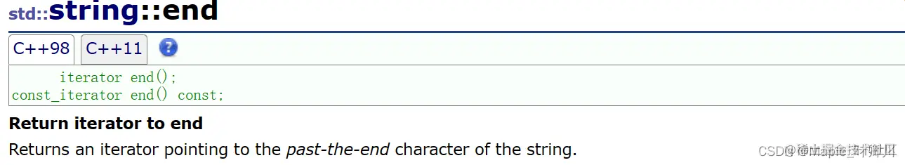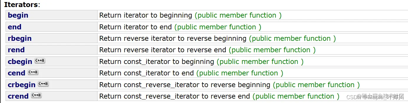 函数名称 函数功能 begin() 返回一个指向字符串中第一个字符的迭代器 end() 返回一个指向字符串最后一个字符下一个位置(‘\0’)的迭代器 rbegin() 反向迭代器,返回一个指向字符串最后一个字符下一个位置(‘\0’)的迭代器 rend() 反向迭代器,返回一个指向字符串中第一个字符的迭代器