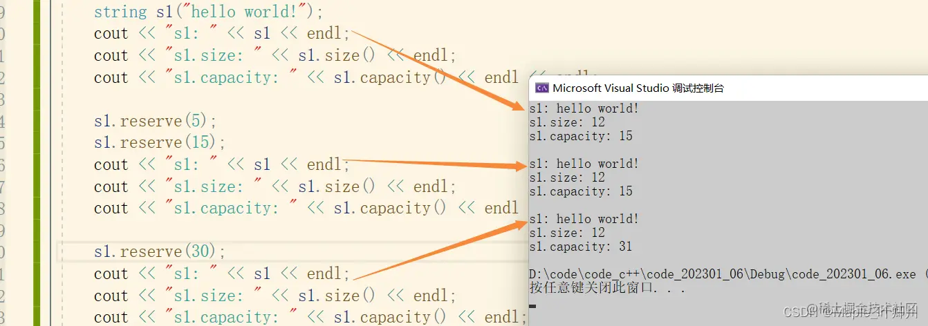 reserve 用来扩容与预留空间,相当于C语言中的 realloc 函数,它分两种情况: