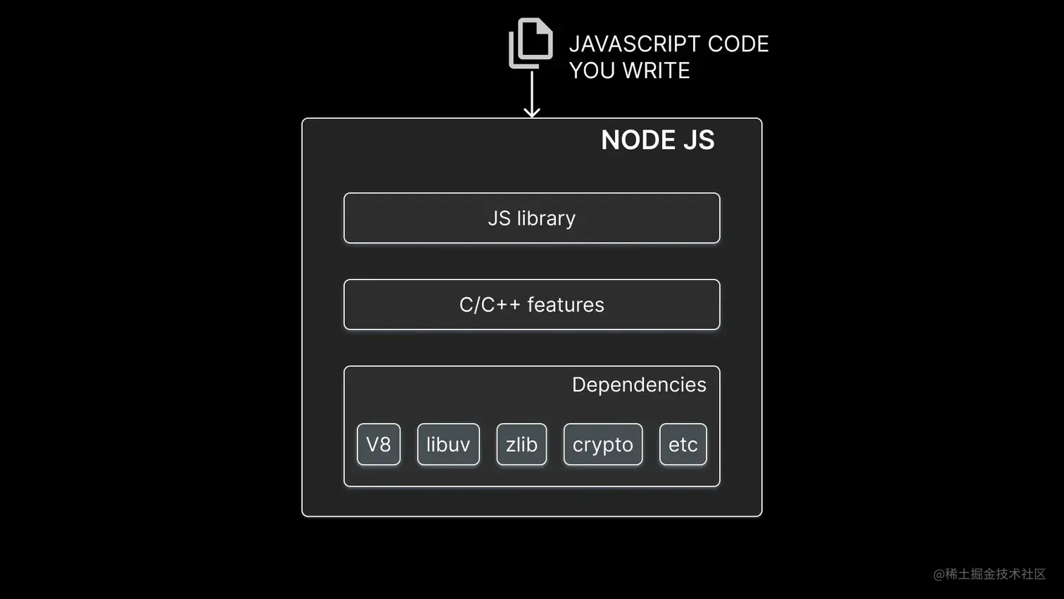 Node.js 运行时是一个可以在浏览器之外使用和运行 JavaScript 程序的环境。Node 运行时的核心由三个主要组件组成。