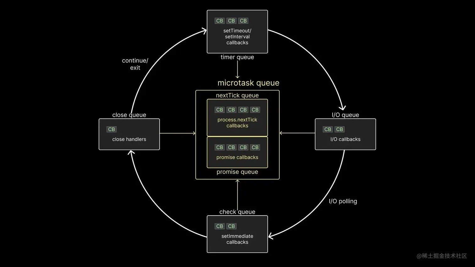重要的是要注意计时器、I/O、check和close队列都是 libuv 的一部分。然而,这两个微任务队列不是 libuv 的一部分。尽管如此,它们仍然是 Node 运行时的一部分,并且在回调的执行顺序中扮演着重要的角色。说到这里,接下来我们就来了解一下。