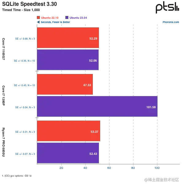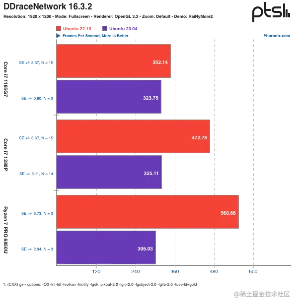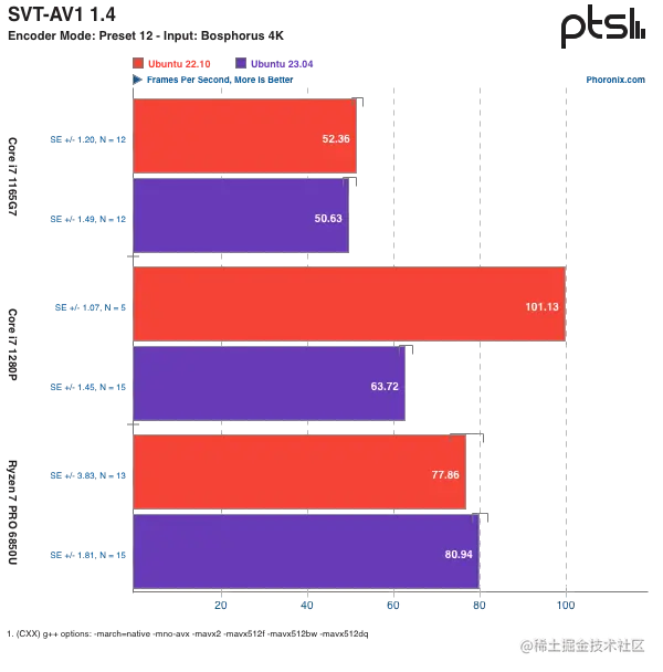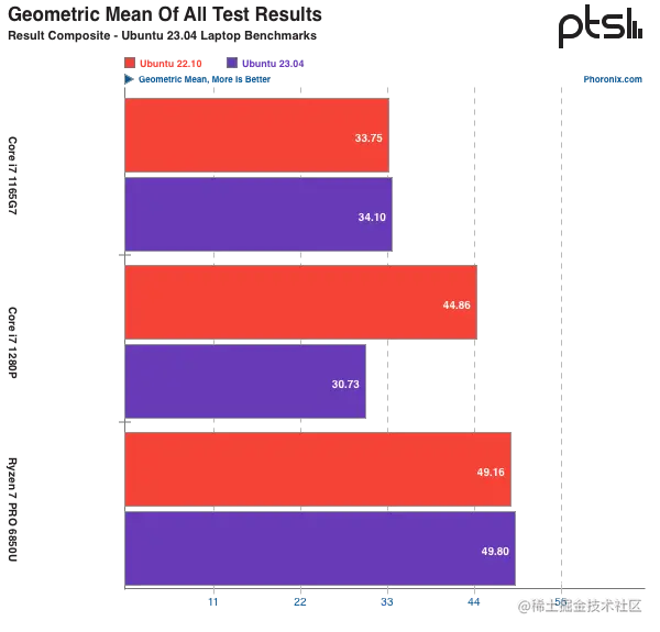 当对在 Ubuntu 22.10 和 23.04 之间的三台不同的笔记本电脑上进行的 67 项测试结果进行几何平均后,英特尔 Tiger Lake 和 AMD Rembrandt 笔记本电脑表现出类似的性能,反而较新的英特尔 Alder Lake 笔记本电脑在 Ubuntu 23.04 上有了明显的性能下降。