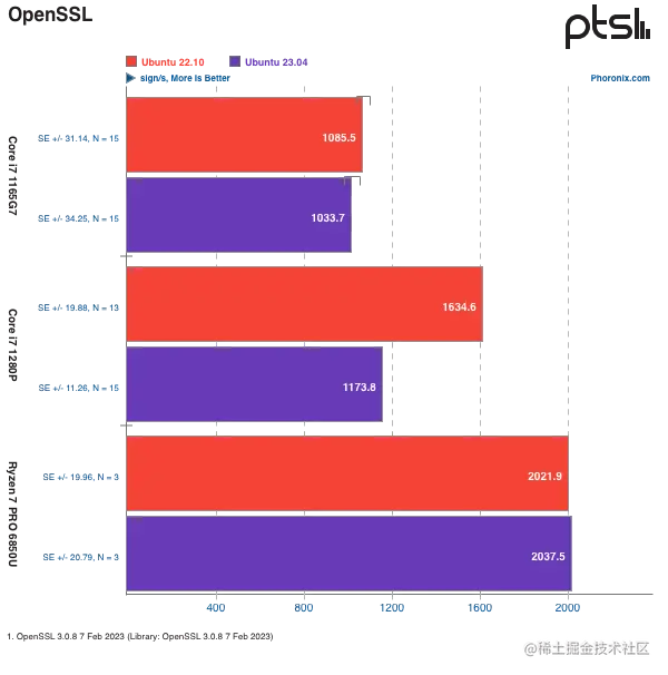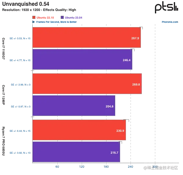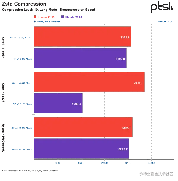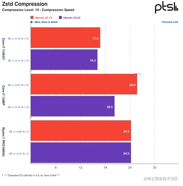 Ubuntu 23.04 的性能相比 Ubuntu 22.10 依然有小幅差距。在这个环节的测试中,英特尔酷睿 i7 1280P 笔记本电脑在 Ubuntu 23.04 下的表现则是比 22.10 差了一大截。