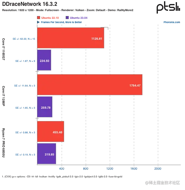 首先进行的是 DDraceNetwork 测试,这是一个开源的合作平台游戏。游戏会使用 Vulkan 或 OpenGL 3.3 进行渲染(测试结果为游戏帧率,分数越高越好)。