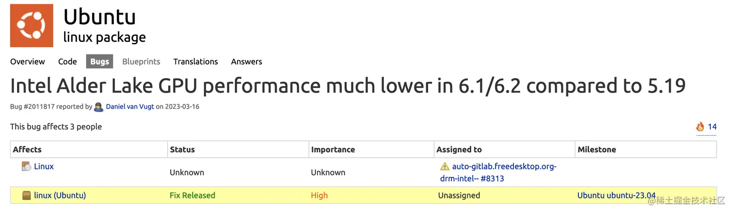 至于 Alder Lake 在 Ubuntu 23.04 性能大幅下滑的原因,测试人员现在也还不清楚。不过,通过 Ubuntu 错误跟踪器,自 3 月中旬以来一直有一个错误报告,该报告显示英特尔 Alder Lake GPU 在 6.1~6.2 内核下比以前的 5.19 内核有了性能的明显退步,并且该问题的重要程度被标记为 "高"。