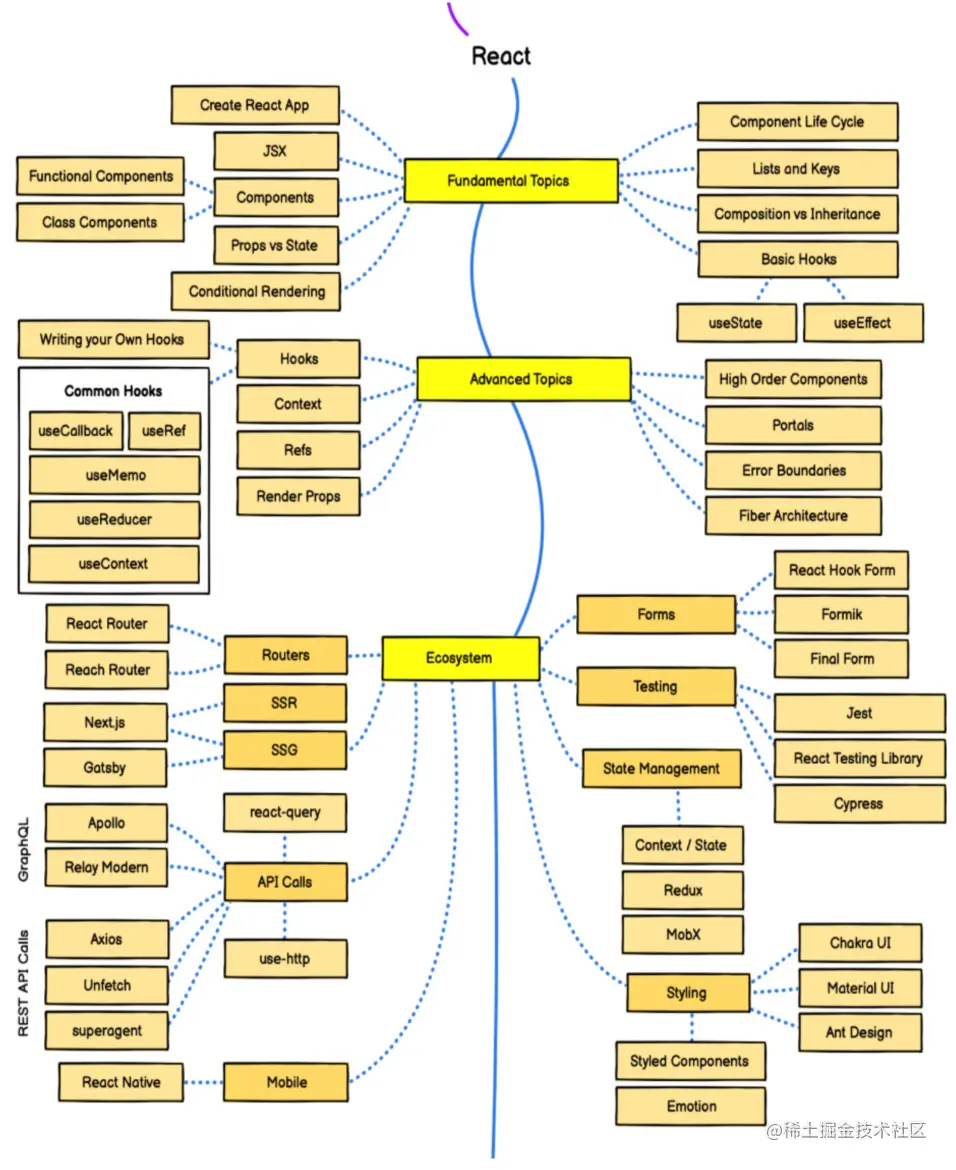 如上图所示,在使用 React 构建应用程序时需要考虑很多因素,注意这张图可能只显示了冰山一角。我们可以使用许多不同的包和解决方案来构建相同的应用程序。